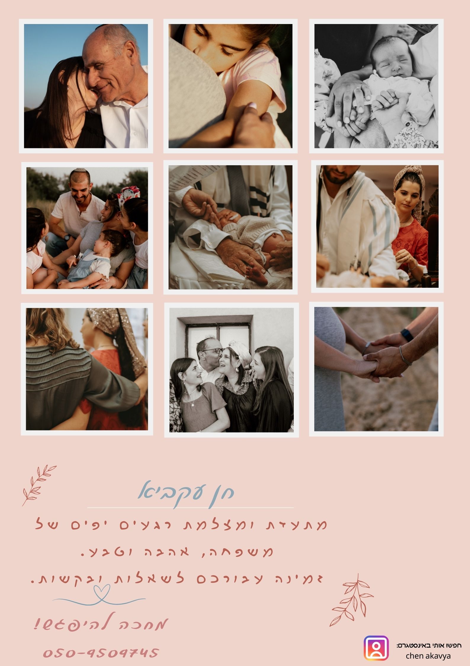 נעים מאוד, בעלת ניסיון בצילומי משפחה, צילומי דורות, בריתות ואירועים נוספים משפחתיים מרגשים.