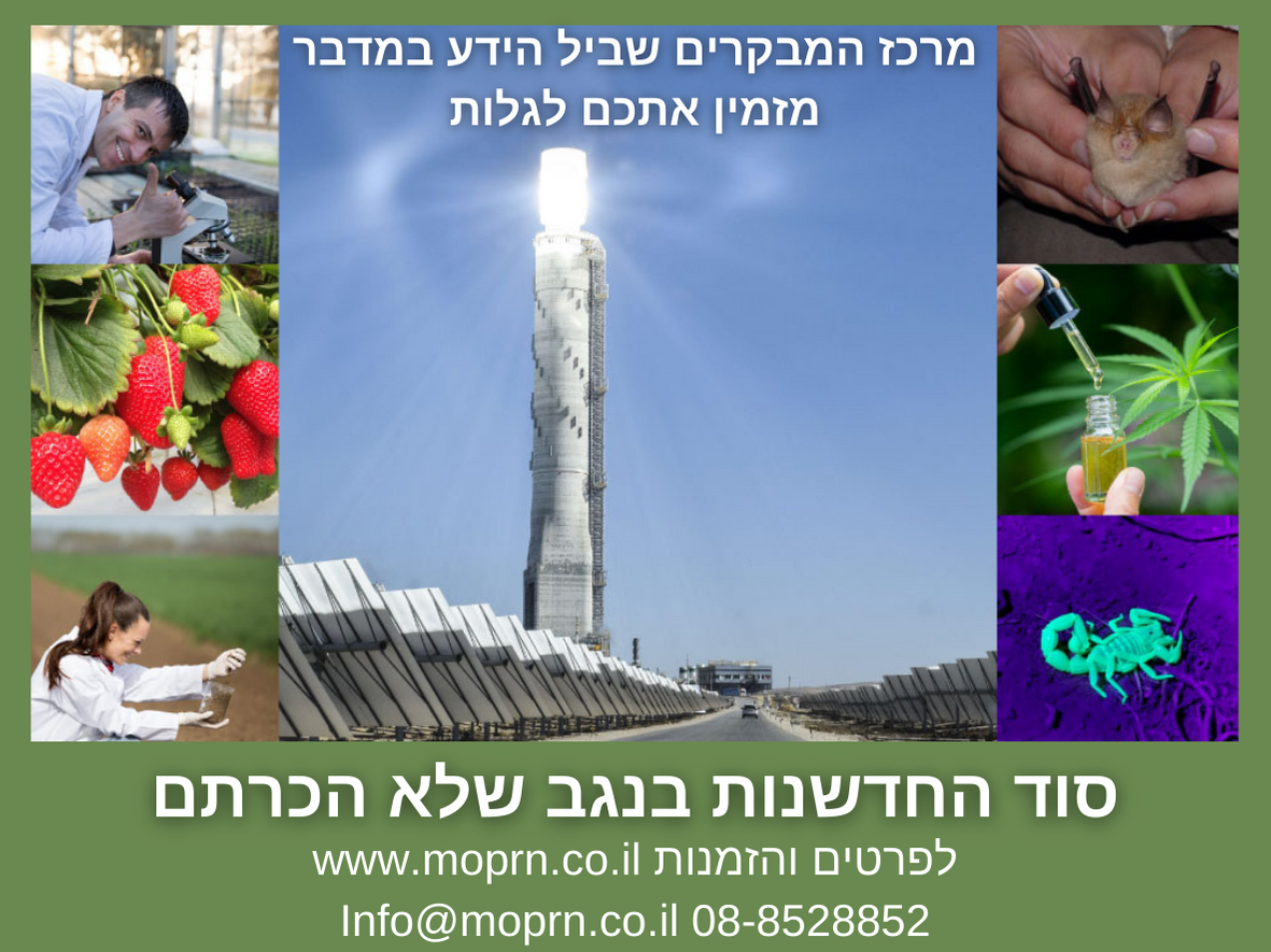 הסיורים מתאימים לקבוצות בכל הגילאים, ובחגים גם למשפחות ויחידים. בסיור נגיע לתצפית מרהיבה על העמק הסולארי והמגדל הגבוה בעולם. בבלעדיות שלנו ניתן לתאם ביקור בתחנת הכוח של המגדל הסולארי. יחד נבין איך החדשנות הישראלית מנצחת ברמה העולמית. נבקר בתחנת הניסיונות לחקלאות מדברית (מו"פ רמת הנגב) ונחשף לחדשנות שבזכותה הצלחנו לפתח חקלאות משגשגת, כנגד כל הסיכויים, בתנאי אקלים קיצוניים, תוך שימוש במים מליחים ועל קרקע חולית. כל הסיורים כוללים גם טעימת ירקות וכניסה לחנות תוצרת הנגב.